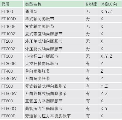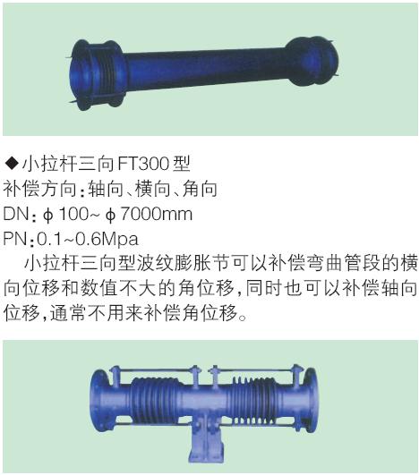 ◆大拉桿橫向FT300B 型 補償方向:橫向(任意) DN:φ100~φ4000mm PN:0.1~2.5Mpa 大拉桿橫向型波紋膨脹節可以補償彎曲管段的 橫向位移和數值不大的角位移,通常不用來補償角 位移。它具有承受內壓推力的能力。 ◆通用FT100型 補償方向: 軸向、橫向、角向 DN:φ40~φ12000mm PN:0.1~2.5Mpa 通用型波紋補償器由一組波紋管和結構件組成, 可分焊接式、法蘭式兩種,主要用于補償管線的軸向 位移,通用補償器屬無約束型,內壓推力必須由主固 定架來承擔、產品上的黃色小拉桿主要是運輸過程 中的剛性支承或作為預變形調節用,它不是承力件, 該類補償器結構簡單,性價比好,在管線上可能之處 應優先予以考慮。